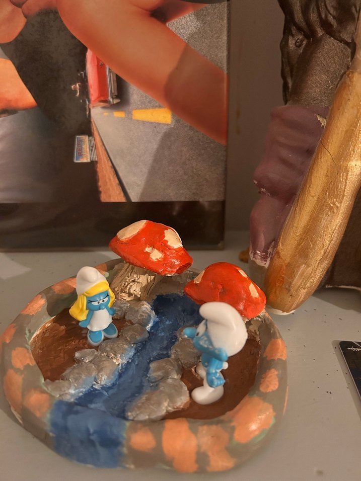Renkli aksiyon figür seti, küçük mavi dere kenarında kırmızı mantarlarla çevrili iki Şirin figürünü içerir. Canlı mavi ve beyaz renklerle detaylandırılmıştır.