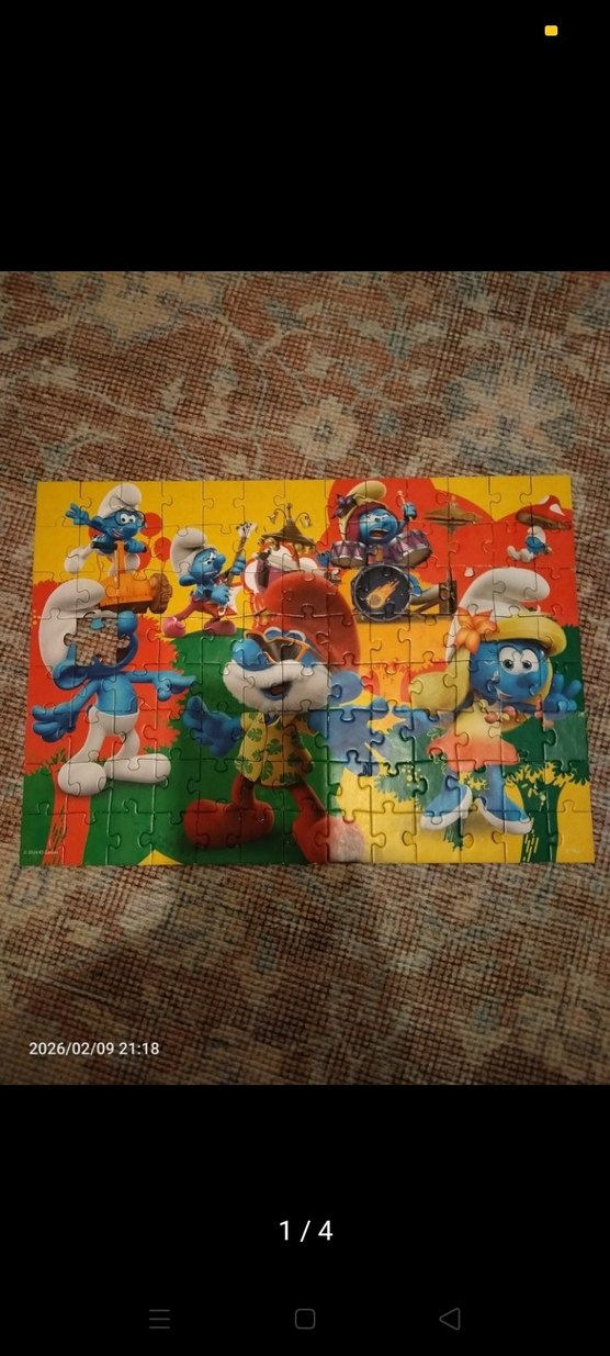 Renkli Şirinler karakterlerini içeren çocuk puzzle'ı. Canlı renkleri ve eğlenceli tasarımıyla çocuklar için keyifli bir aktivite. bir parca eksik onun dışında sorunsuz kutusu yok