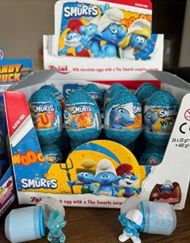 Renkli Şirinler temalı sürpriz yumurtalar ve içinde toplanabilir figürler bulunur. Her yumurta mavi renkte ve Şirinler karakterlerini içerir.