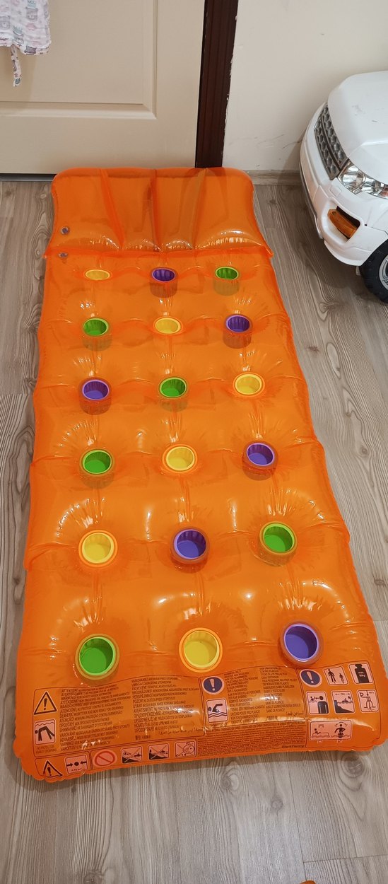 Bu renkli şişme su oyuncağı, turuncu taban üzerinde çeşitli renklerde çoklu bardak tutucular içerir, suyun içinde eğlence ve rahatlama sağlar.