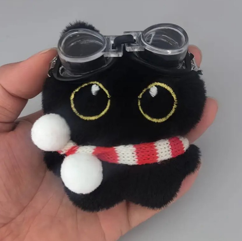 Büyük işleme gözlere ve kırmızı-beyaz çizgili atkıya sahip renkli siyah kedi. Üstünde şeffaf plastik gözlükler bulunur. Bu ilanı alabilirsiniz