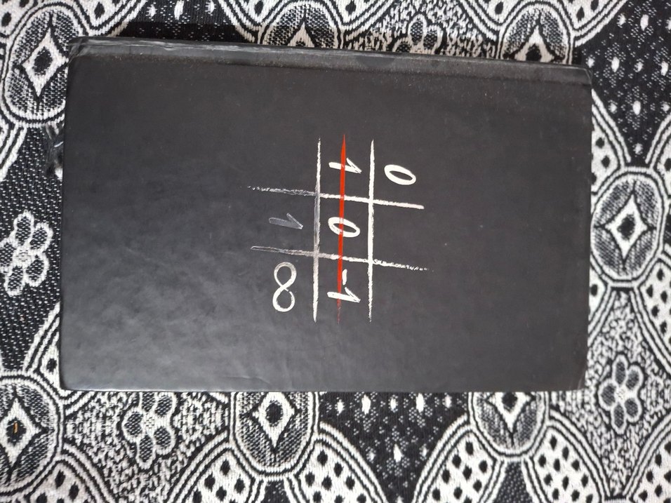 Üzerinde beyaz ve kırmızı çizgilerle renkli üç taş oyunu çizimi bulunan siyah tahta oyun seti.
