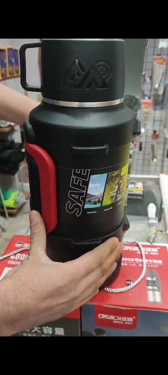 Renkli siyah yetişkin termosu, kolay taşınması için kırmızı saplı güvenli tasarıma sahiptir. Sıcak içecekler için uygundur.