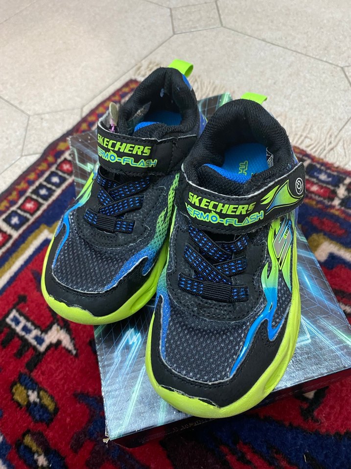 Renkli bağcıklı ve Velcro bantlı, kauçuk tabanlı, sokak tarzı erkek çocuk spor ayakkabısı.Orjinal skechers marka. 27 numaradır. Cırtcırt kısmının tamir ihtiyacı vardır.Başka bir sorunu yoktur.