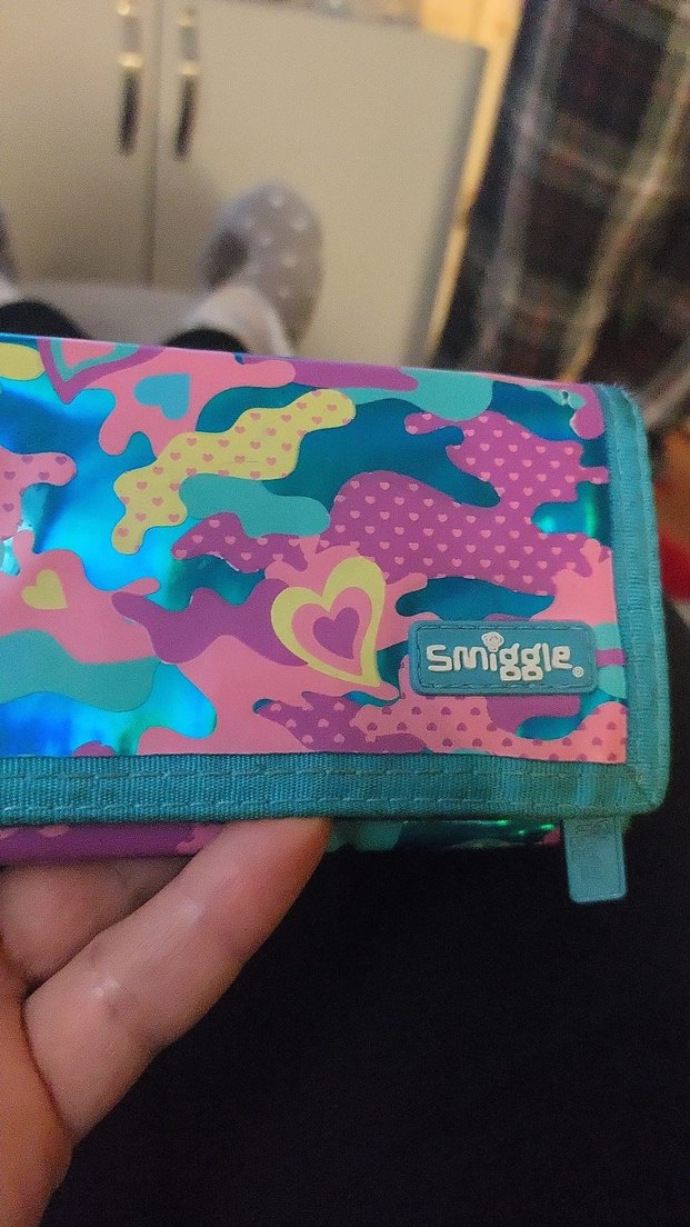 Renkli ve desenli kalpli detaylı Smiggle çocuk cüzdan dayanıklı parlak malzemeden üretilmiştir.