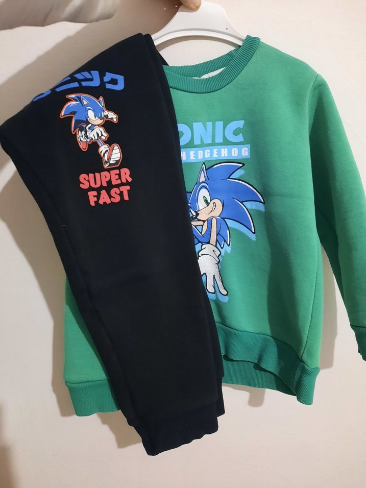Renkli, bol kesim, bisiklet yaka sweatshirt ve baskılı fleece kumaşlı eşofman altı, cırt cırt detaylı ve Sonic baskılıdır. ♂️