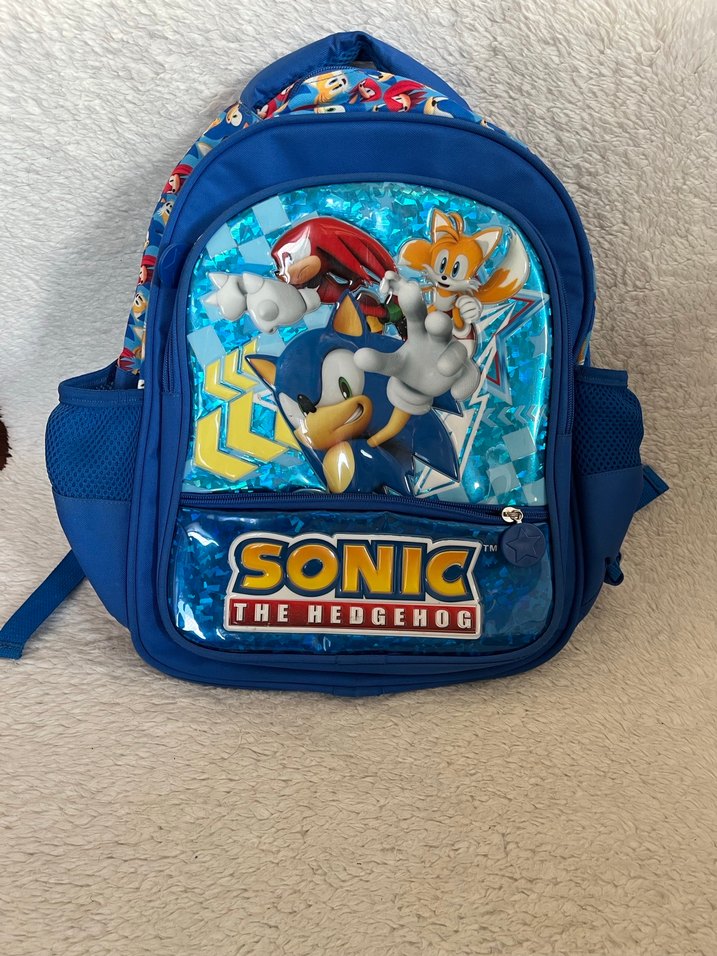 Sonic ve arkadaşlarının yer aldığı, renkli mavi çocuk okul çantası. Çoklu bölmeler ve yan file cepler içerir.
