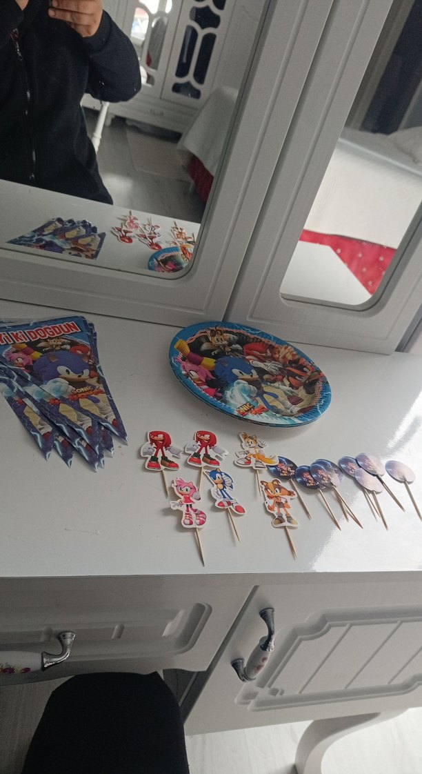 Sonic the Hedgehog temalı, renkli figürler ve parti aksesuarları içeren set. 8 adet tabak 1 adet doğum günü yazılı 6 tane karakter kürdanlı 8 tane kürdan pasta kürdanı