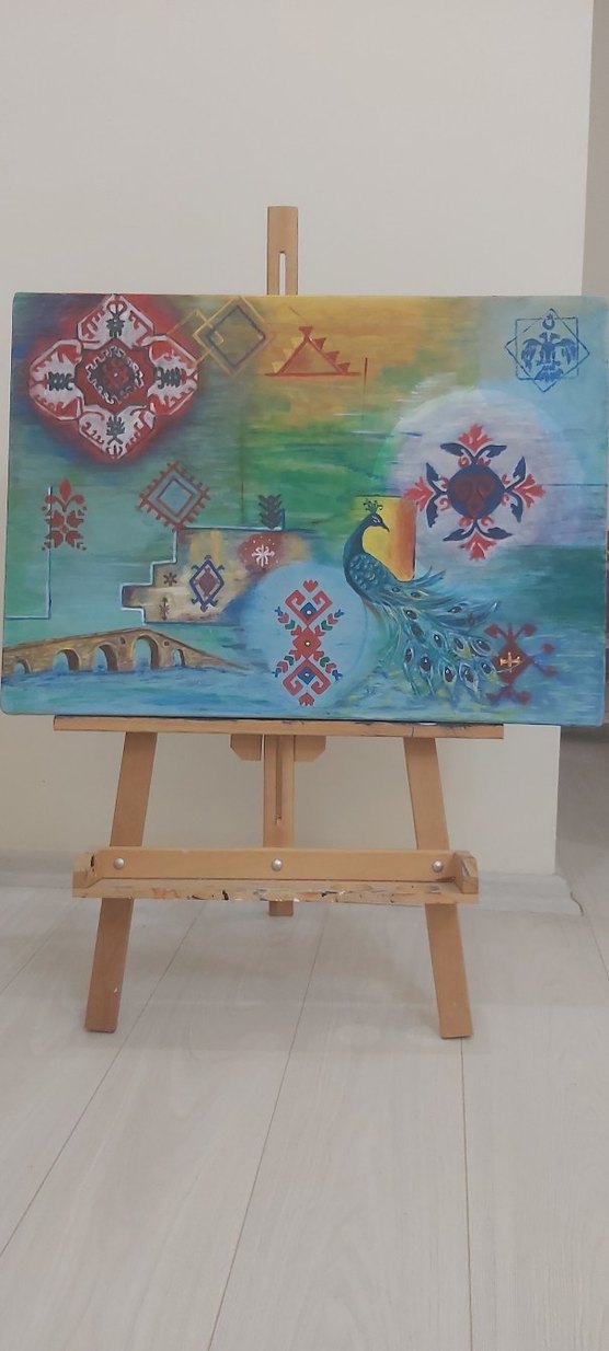 Bu kanvas tabloda soyut desenler ve tavus kuşu motifi, sıcak ve soğuk tonlarla canlı bir şekilde harmanlanmıştır. bereket ,sans ,güc sembollerine yer verilmis Anadolu motifleri ile suslenmis bir tablo