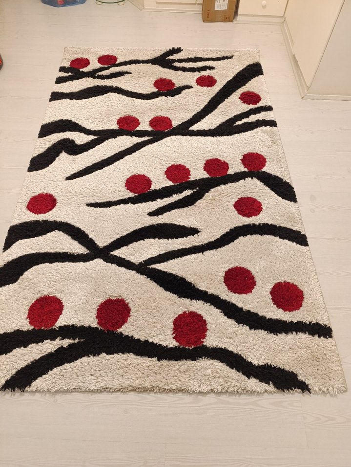 Bu modern halı, açık zemin üzerinde siyah çizgiler ve kırmızı noktalarla soyut desen sunar. Renkli bir dokunuş sağlar.