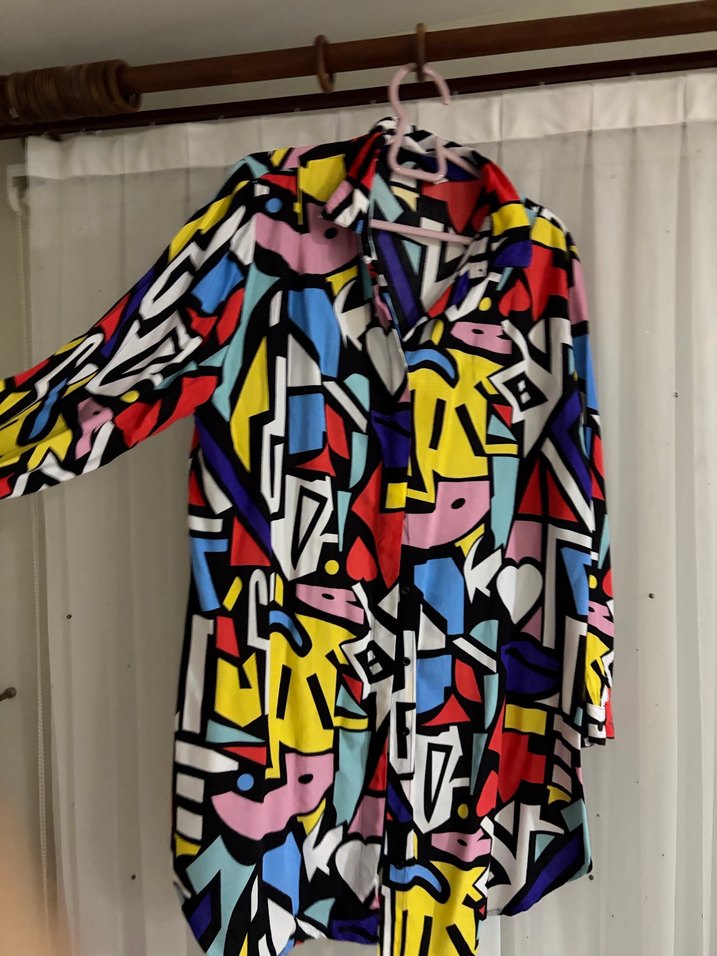 Renkli soyut desenli, düğmeli, uzun kollu, V yakalı, bol kesim kadın gömlek. Sentetik kumaştan, sokak stili için uygun. Bayan gönlek tunik / 42-46 beden arası uyumludur