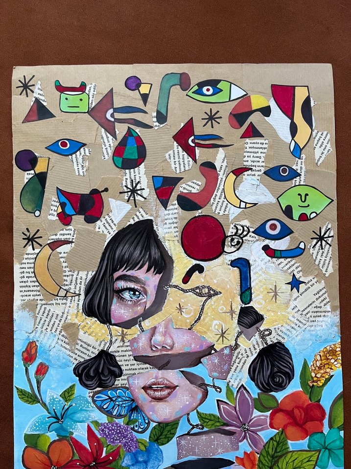 El yapımıdır akrilik boya ve farklı tekniklerle yapılmıltır. Bu canlı tablo, soyut bir kadın portresi ve etrafında renkli şekiller, gözler ve çiçekler içerir.