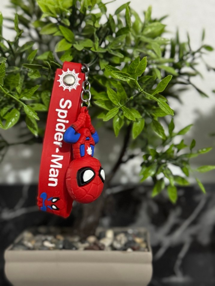 Renkli Spider-Man yazılı kurdele ve küçük figürlü kadın anahtarlık, pop kültür ve minimalist rock punk tarzını yansıtıyor. ️