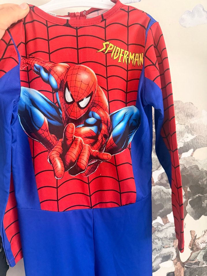 Uzun kollu, boğazlı ve fermuarlı, Spiderman baskılı renkli çocuk kostümü. Kırmızı ve mavi tonlarla şık ve uyumlu. 3,4,5 yaa uyumlu Uzunluğu 90 cm