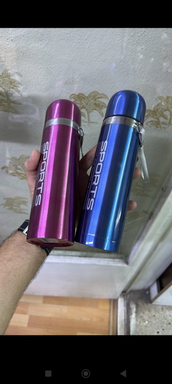 Mor ve mavi renklerde, içecekleri sıcak veya soğuk tutan renkli spor termos şişeleri. Metalik parlak yüzeye ve taşıma kayışına sahiptir.