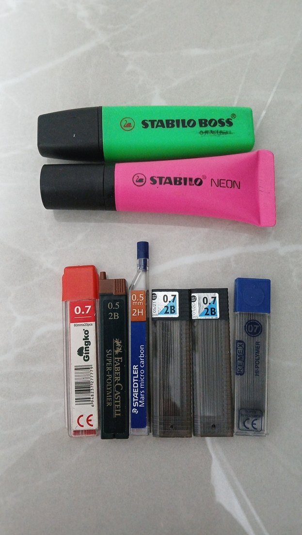 Renkli Stabilo fosforlu kalemler ve farklı sertliklerde 0.7, 0.5, 2B, 2H uçlar içeren set, yazma ve işaretleme için uygundur. ️hepsinin fiyatıdır.