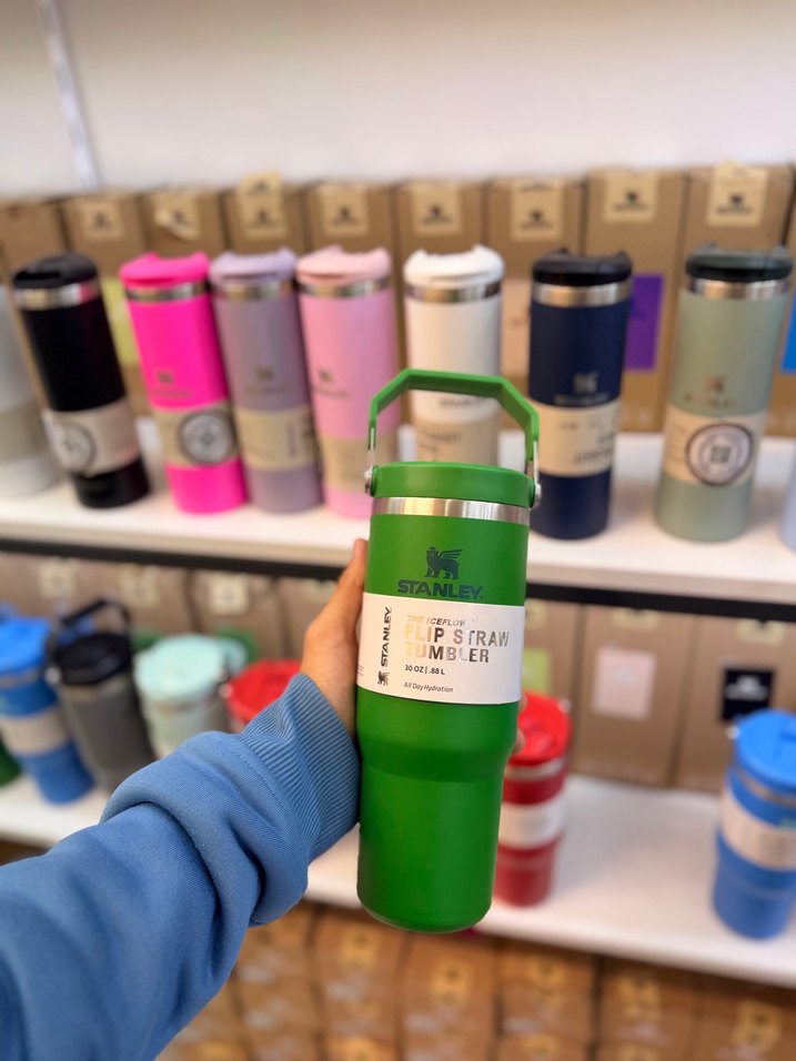 Renkli Stanley çocuk termos matara, taşınabilir saplı ve içecekleri sıcak ya da soğuk tutar. Üzerinde "Flip Straw Tumbler" etiketi bulunur.