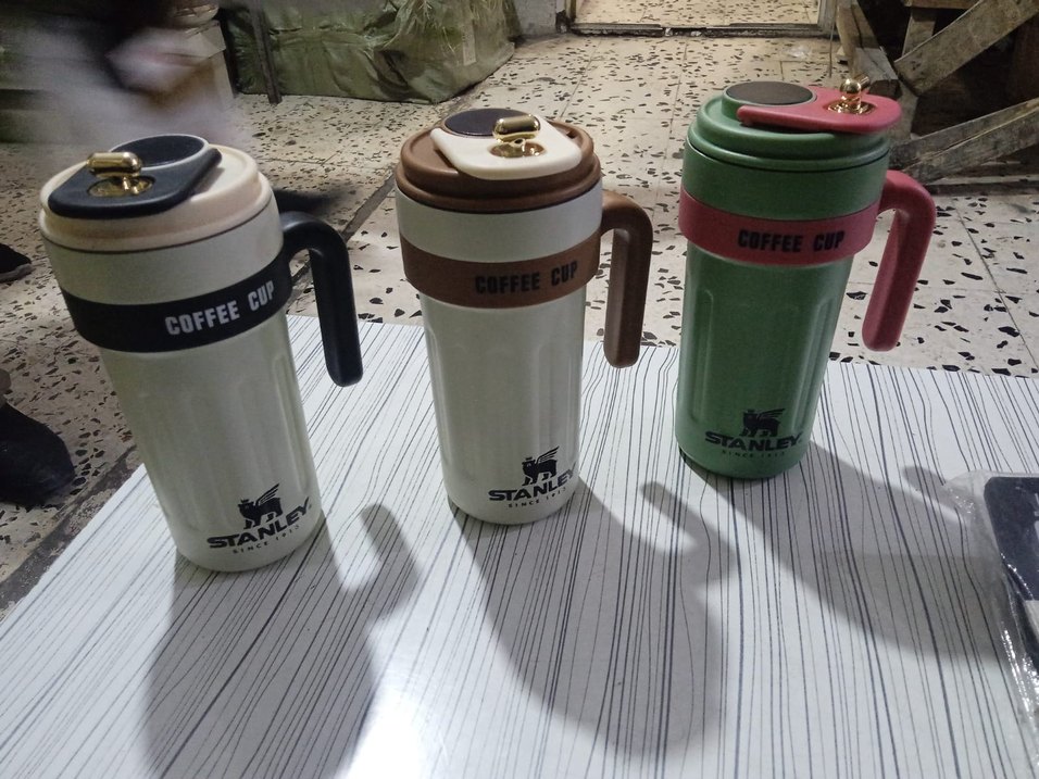 Renkli Stanley termos bardak, beyaz renkte, kulplu ve sızdırmaz kapaklıdır. Üzerinde 'COFFE' yazısı bulunmaktadır. ☕️