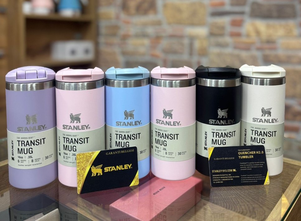 Renkli Stanley Transit termos bardak, 0.35L kapasite ile içeceklerinizi uzun süre sıcak veya soğuk tutar. Dayanıklı ve kullanışlıdır. ☕