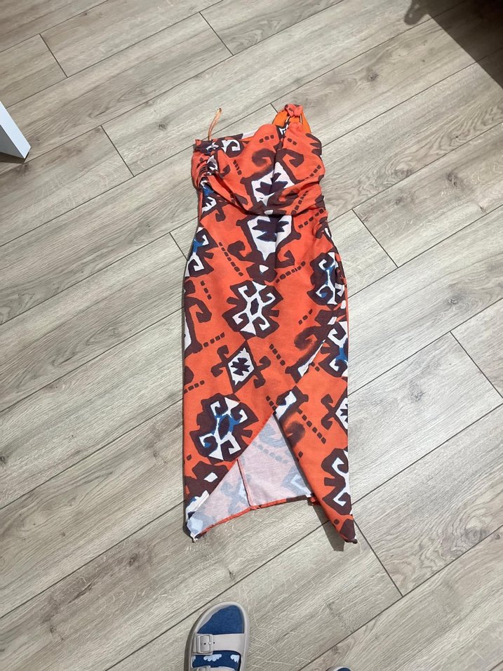 Renkli tie-dye desenli, straplez ve drapeli bohem tarzda, sentetik kumaştan yapılmış uzun ve vücuda oturan elbise.