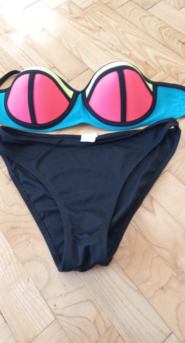 Renkli, strappy üstü ve siyah altıyla dikkat çeken, sıkı kesim bikini. Sahilde rahat ve şık kullanım için ideal. ️