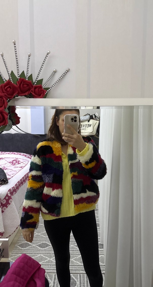 Renkli, peluş detaylı, uzun kollu ve salaş kesim kadın ceketi. Hafif renklerde tie-dye deseniyle günlük kullanıma uygun, bohem tarzda bir parça. Defosu yok m beden kalıp tam