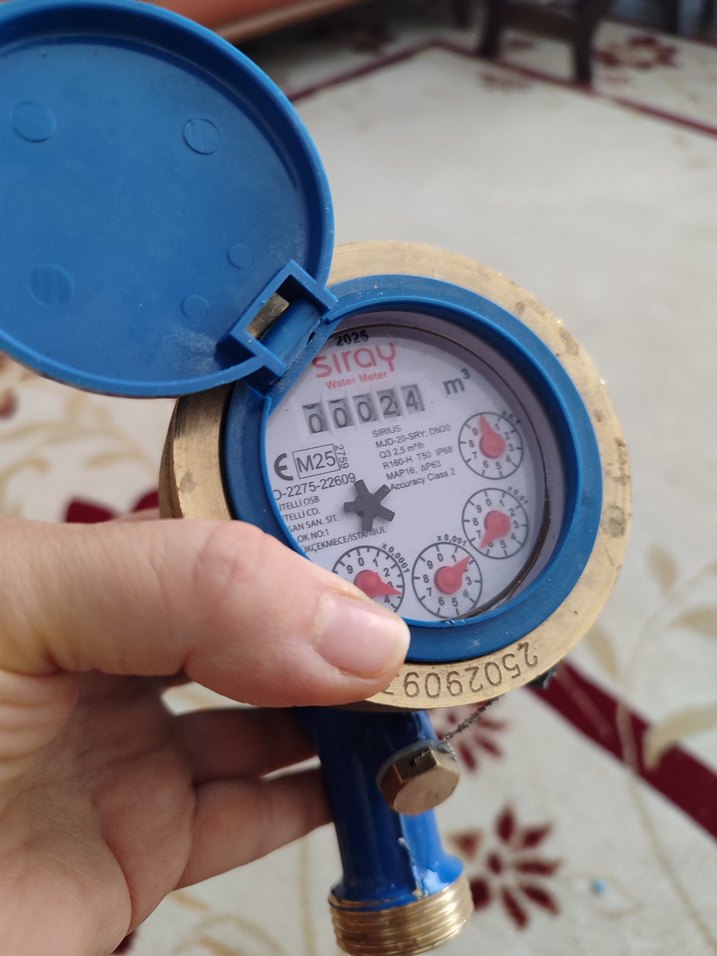 Koruyucu mavi kapaklı renkli EM25 model su sayacı, net kadran ve hassas ölçüm sonuçları gösterir.
