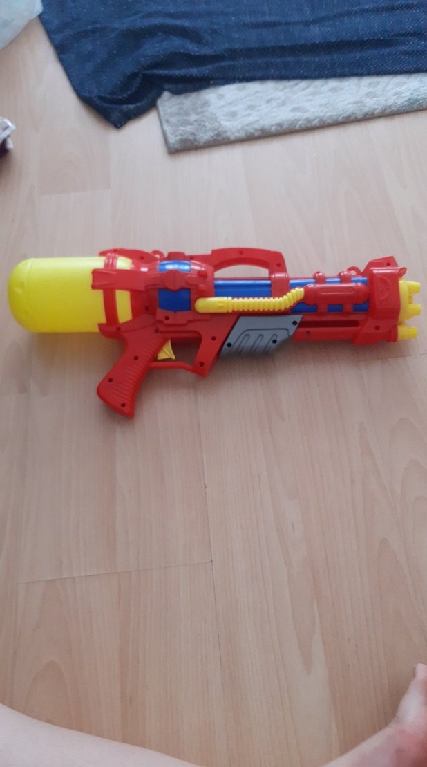 Kırmızı gövde ve sarı su tankına sahip renkli su tabancası, dış mekan su oyunları için uygundur. Canlı ve eğlenceli bir oyuncak.