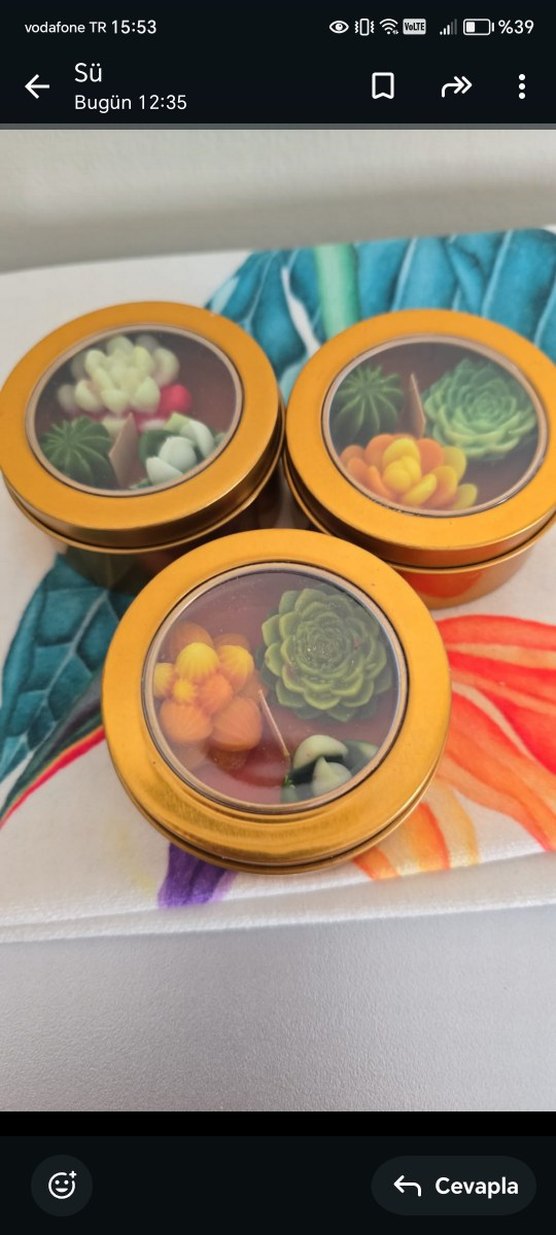 Altın kapaklı kutularda, sukulent desenli renkli mum seti. Dekoratif kullanım için uygundur. ️