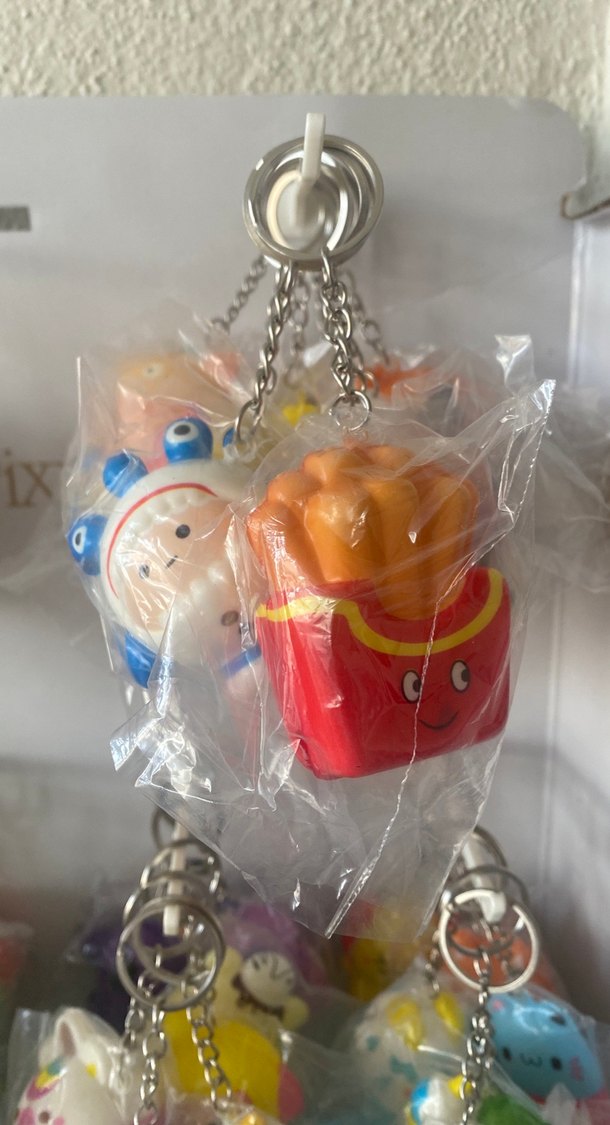 Renkli anahtarlık, gülümseyen kızarmış patates figürü ve mavi gözlü sevimli bir karakter içerir. Gümüş zincirlere bağlı ve şeffaf poşette paketlenmiştir.