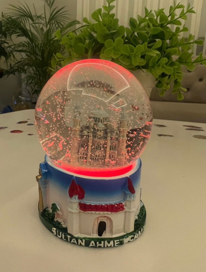 Sultan Ahmet Camii'nin renkli detaylarla süslenmiş kar küresi. İçinde kırmızı ışık yayan şeffaf küre hoş bir atmosfer yaratır. Orta boy ışıklı sıfır
