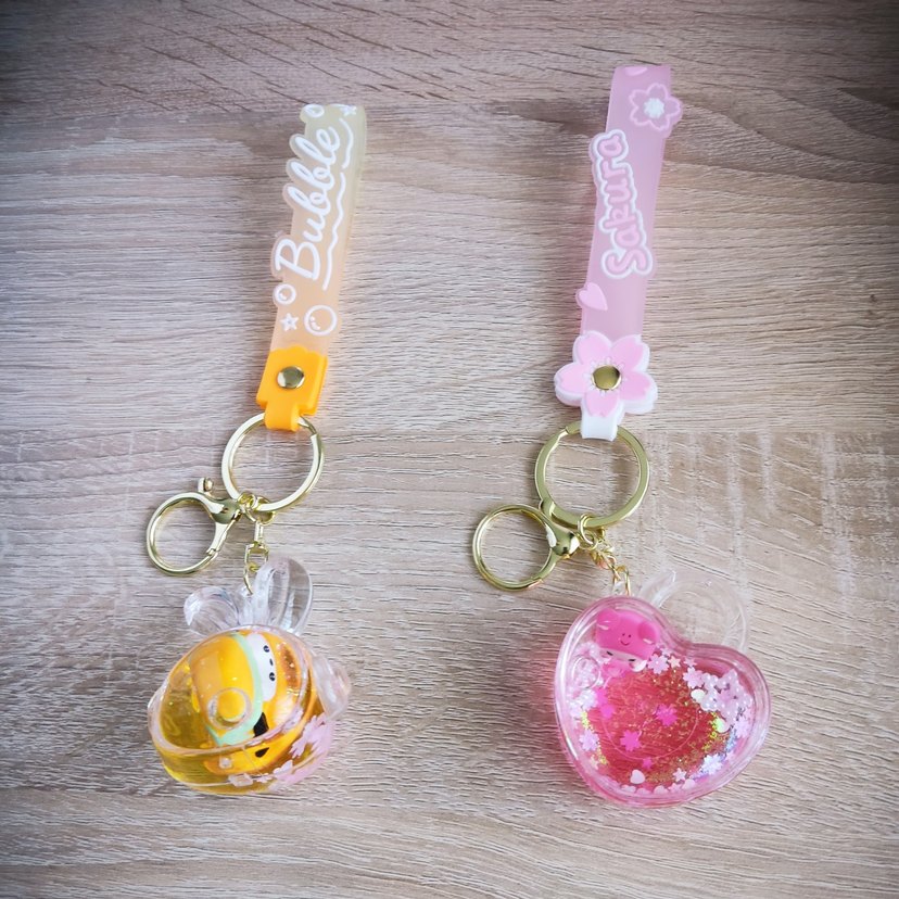 Renkli sulu süslenmiş, pembe ve sarı tonlarında bubble ve sakura desenli kadın anahtarlıkları. Bohem ve minimalist tarza uygun.