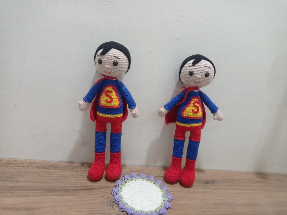 Kırmızı pelerinli, mavi kıyafetli ve göğsünde 'S' harfi bulunan renkli örgü süper kahraman figürleri. Yumuşak ve el yapımı tasarım. sipariş üzerine yapılır boyu 28/30 cm arasındadır