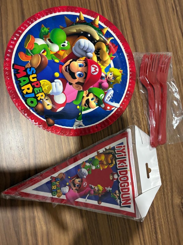 Renkli Super Mario temalı tabaklar, kırmızı plastik çatallar ve karakterlerin olduğu üçgen parti bayrağı içerir. Doğum günü için alıp kullandık . Hepsi sıfır gibi . Bir kaç saat sonra kaldırıldı . Tabaklar ve çatallar hiç kullanılmadı . 9 adet bayrak flama var içerisinde . İple birleşik şekilde . Tabak 8 adet . Çatallar 8 adet .