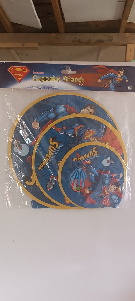 Renkli ve mavi tonlarda, Superman temalı üç katlı cupcake standı. Parti ve etkinliklerde cupcake sunumu için uygundur.