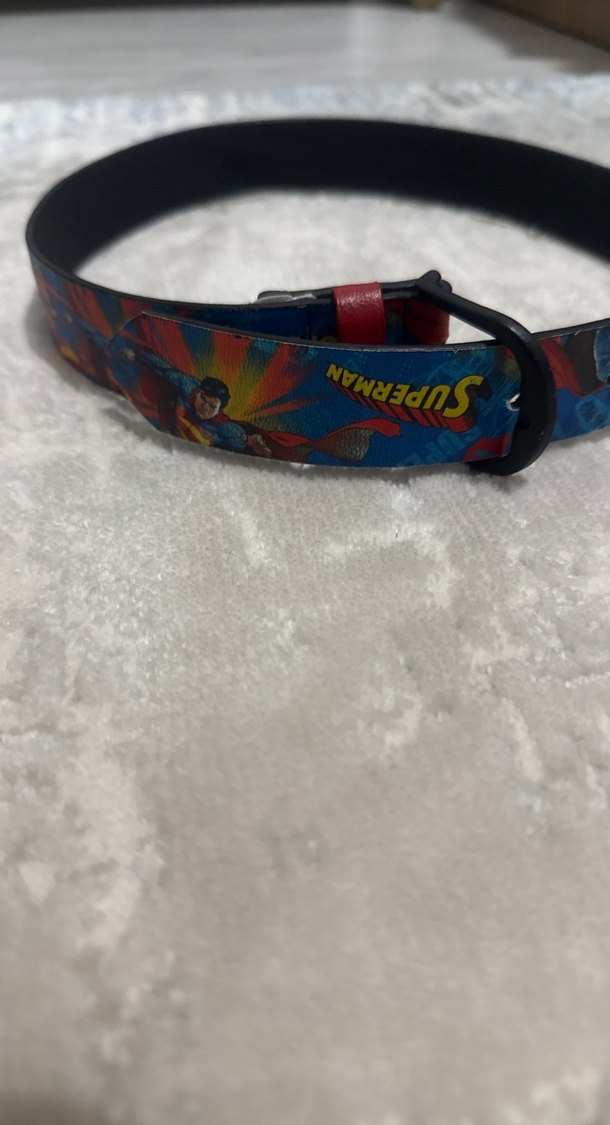 Renkli deri kemer, Süperman baskılı ve tokalı tasarıma sahip. Rock punk ve sokak stilini yansıtan dikkat çekici bir aksesuar.