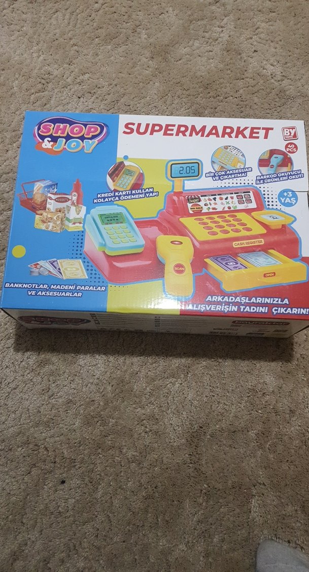Kasa, barkod okuyucu, oyun paraları ve aksesuarlar içeren renkli süpermarket oyuncak seti. Kredi kartı ödeme özelliği bulunur.