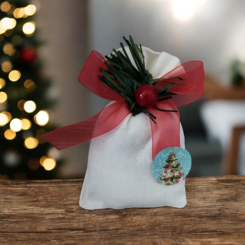 Kırmızı kurdele ve çam dalı süslemeli, renkli detaylara sahip beyaz hediye lavanta kesesi. yılbaşı hediyesi