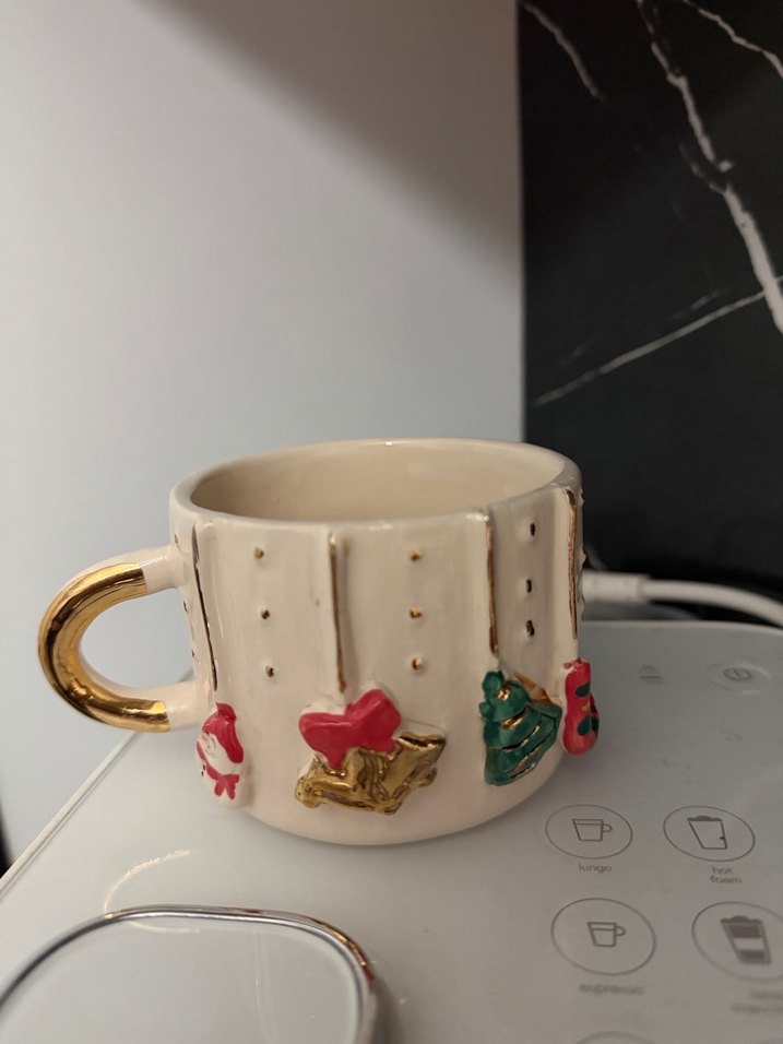 Beyaz seramik kupanın üzerinde renkli tatil süslemeleri ve altın renkli kulp bulunur. Festif içecekler için uygundur. ☕