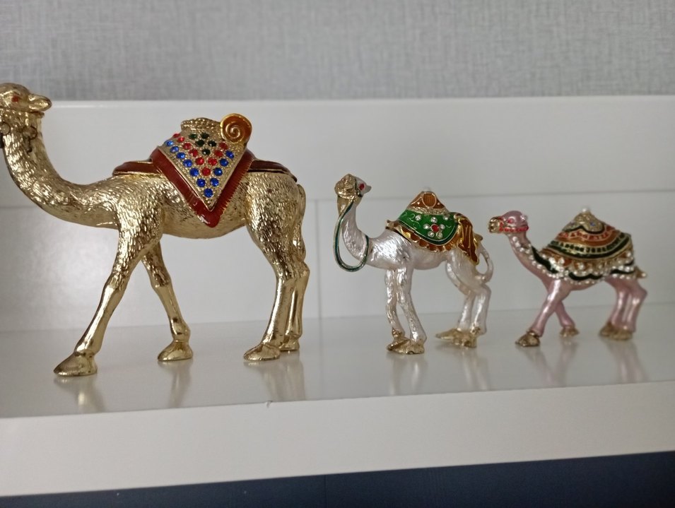 Renkli süslemelerle detaylandırılmış deve figürleri, canlı renklerle öne çıkıyor.