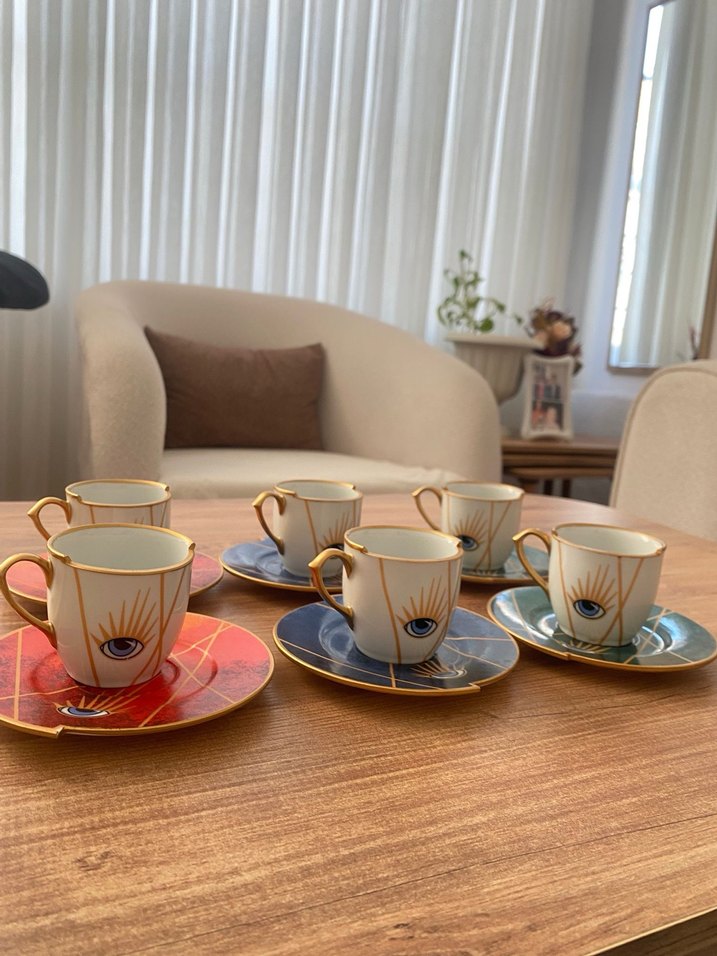 Altın detaylı göz deseni bulunan Türk kahvesi fincanları, her biri renkli tabaklarla birlikte sunulmaktadır. ☕️