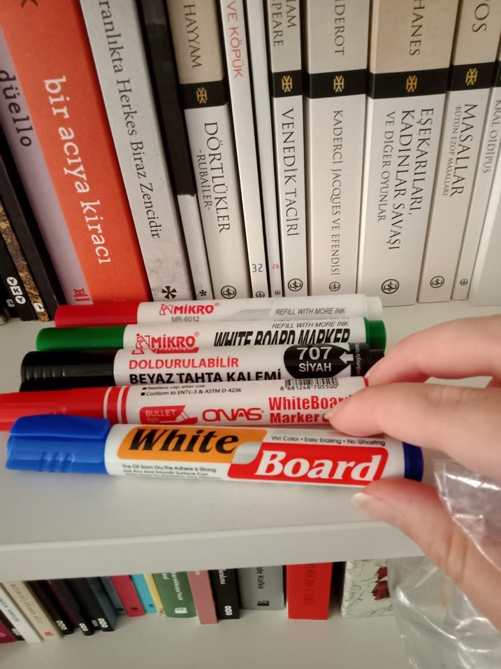 Renkli beyaz tahta kalemleri seti, siyah ve mavi dolabilir kalemler içerir.Ankara içi elden teslim edilebilir.