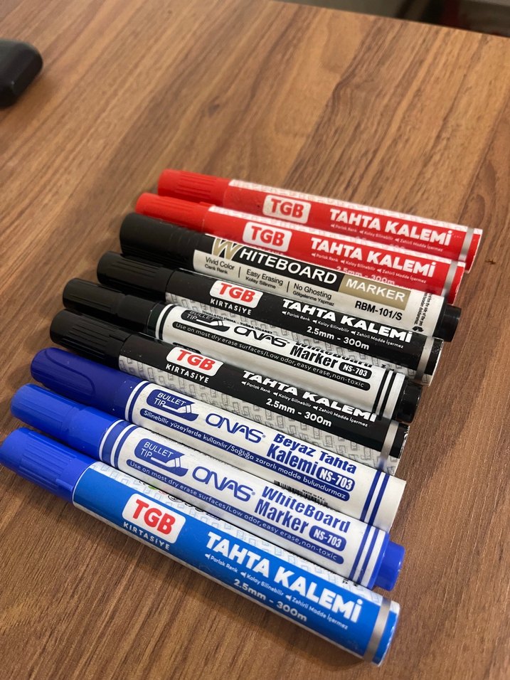 Kırmızı, siyah ve mavi renklerde 2.5mm uçlu tahta kalemleri seti. TGB ve ONAS markalarını içerir. Tahtada yazmak için uygundur dokuz adet sıfır hiç kullanılmadı