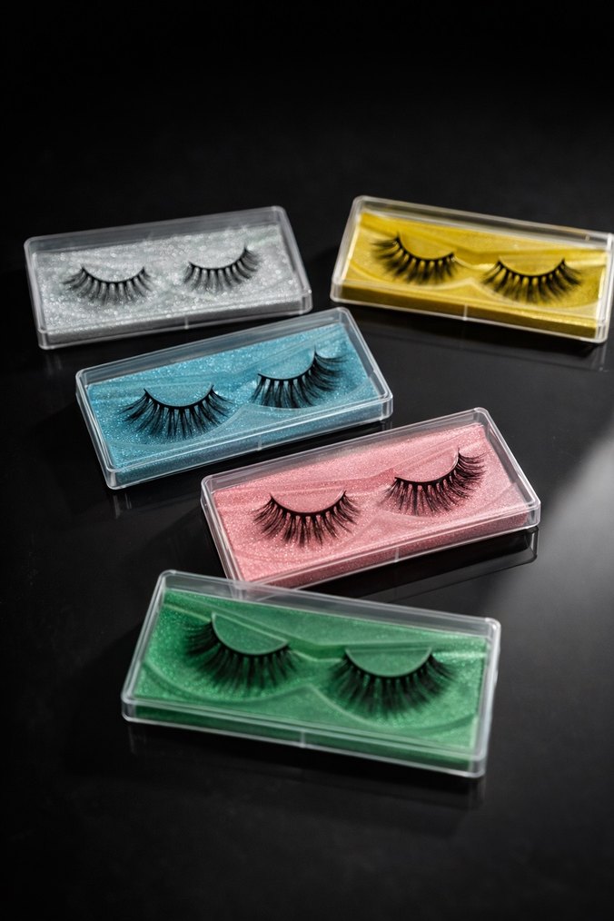 Farklı canlı renklerde, her biri şeffaf kutuda ve uyumlu renkli zeminle sunulan renkli takma kirpikler . 5’li paket