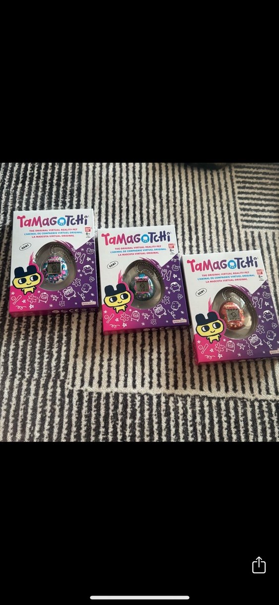 Çeşitli canlı renklerde kutusunda Tamagotchi dijital evcil hayvan oyuncakları. Her biri Tamagotchi logosu ve eğlenceli karakter tasarımları içerir.