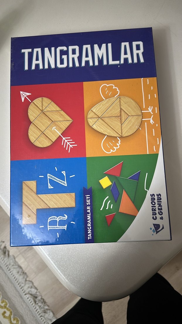 Renkli tangram parçalarından oluşan eğitim seti, yaratıcı öğrenme ve şekil tanıma için uygundur. Kutuda 'TANGRAMLAR' yazısı yer alır.