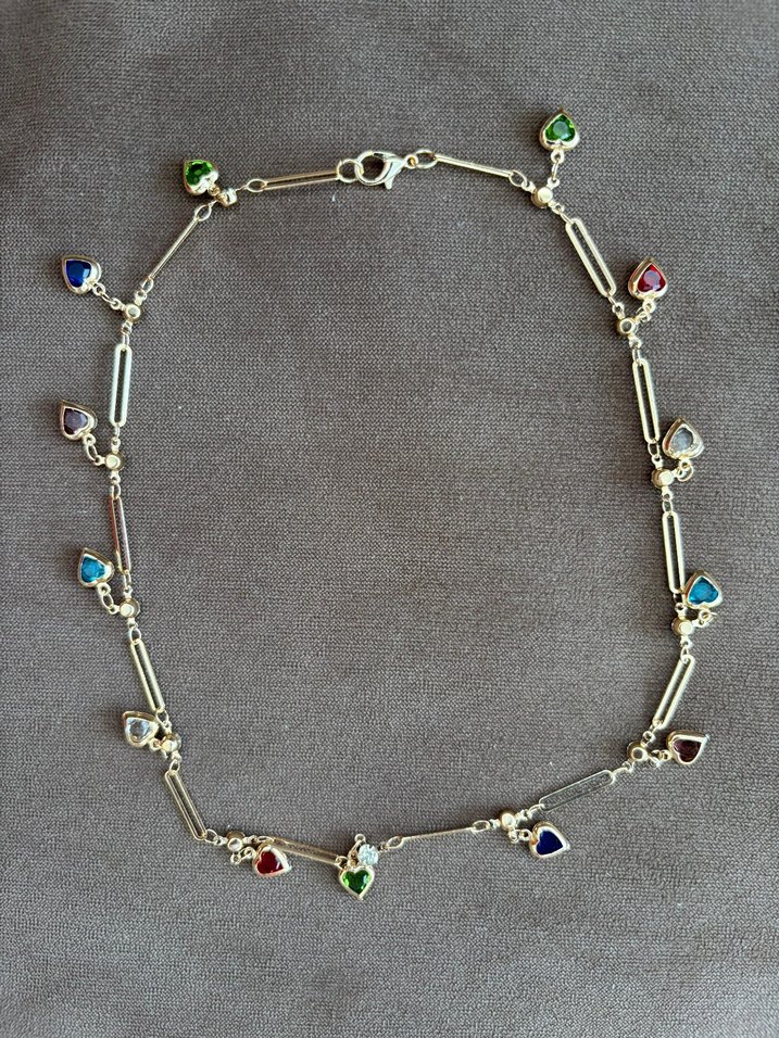 Renkli kalp şeklinde taşlarla detaylandırılmış zincir, bohem ve ışıltılı tarzları romantik anlar için birleştirir.