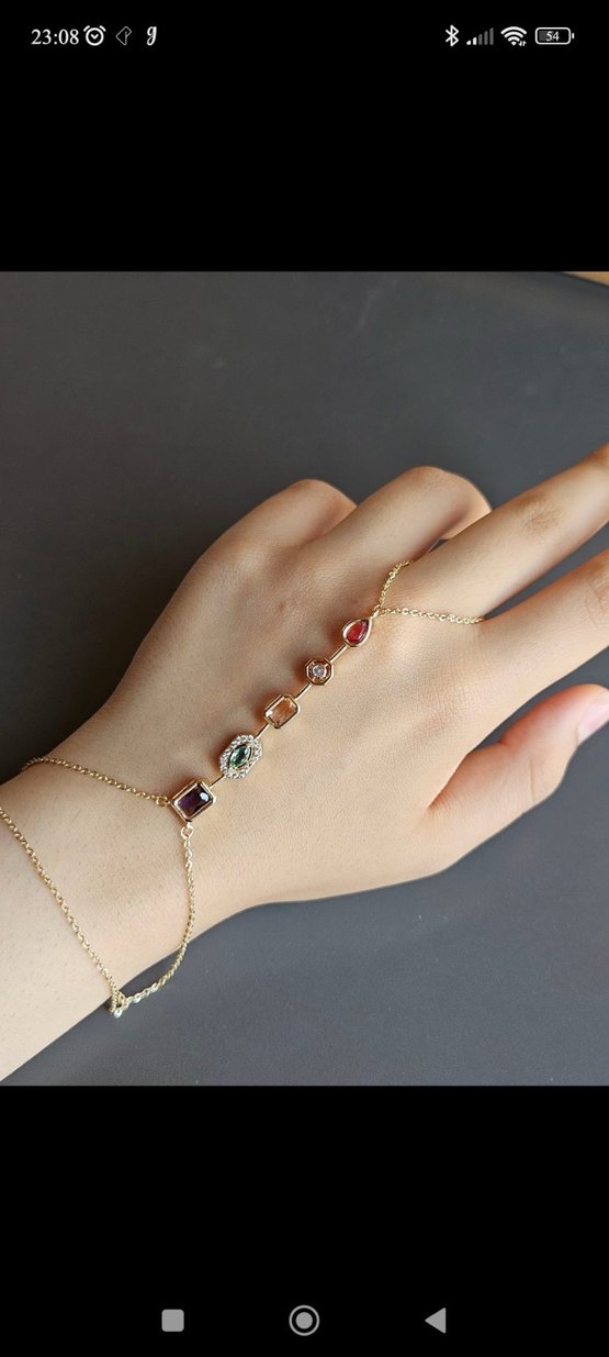 Renkli taşlar ve yılan desenli zincir detaylı kadın el aksesuarı, minimal ve bohem tarzı yansıtır.