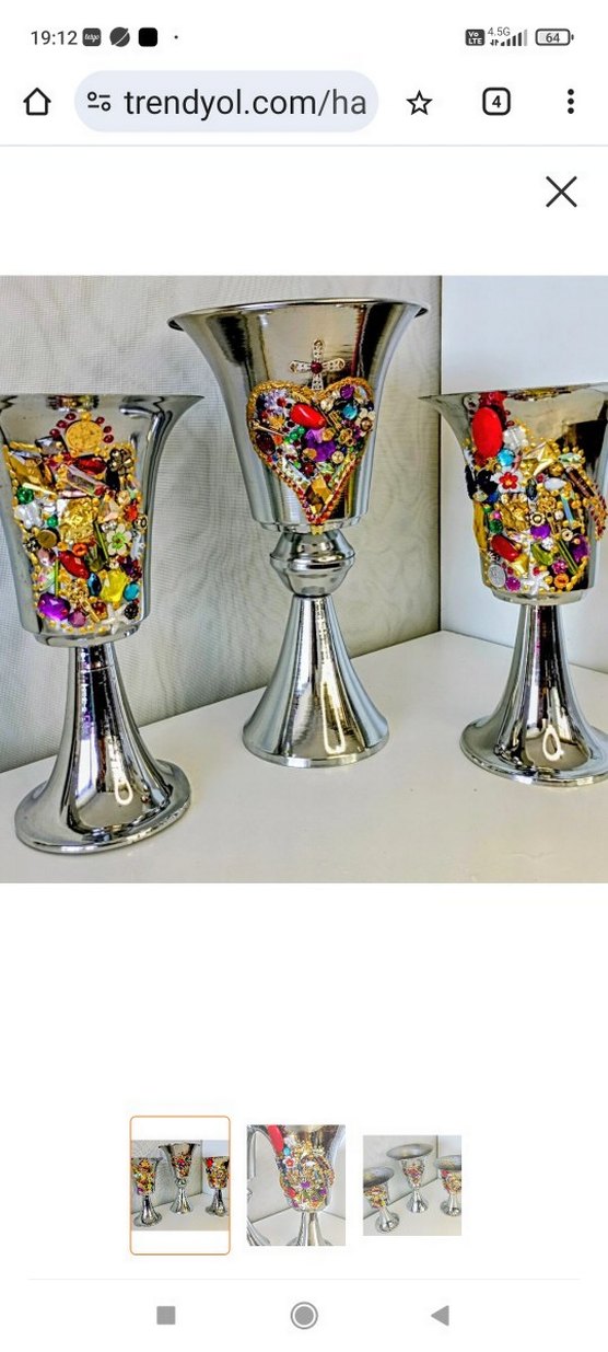 Parlak gümüş tabanlı, renkli taş süslemeli üç metal vazo seti. Her biri farklı desenlerde canlı süslemelere sahip.