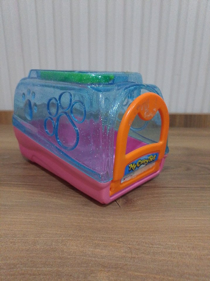 Pembe tabanlı, mavi şeffaf üst kısmında pati izleri bulunan renkli taşıma kutusu ve kedi tuvaleti. Kolay taşınması için turuncu kulpu vardır.